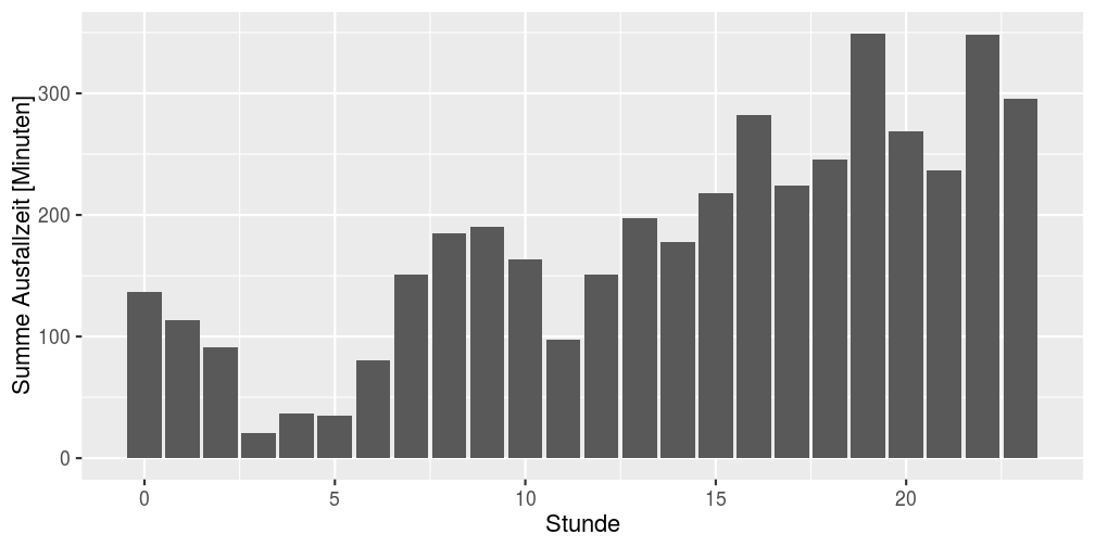 Bei der Betrachtung der Ausfallzeiten gestaffelt nach Stunden zeigen sich die meisten Ausfälle in den Abendstunden, was eine gewisse Abhängigkeit von der generellen Auslastung erahnen ließe.